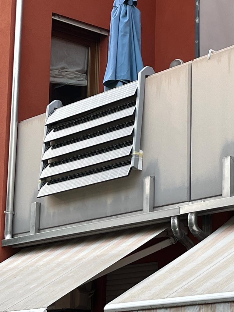 Sistemi fotovoltaici a pannelli solari orientati ideati per ridurre i costi energetici di case e condomini grazie alla struttura modulare posizionabile su parapetti e balconi irraggiati dal sole, in questo caso con apposite staffe per il montaggio su muratura.